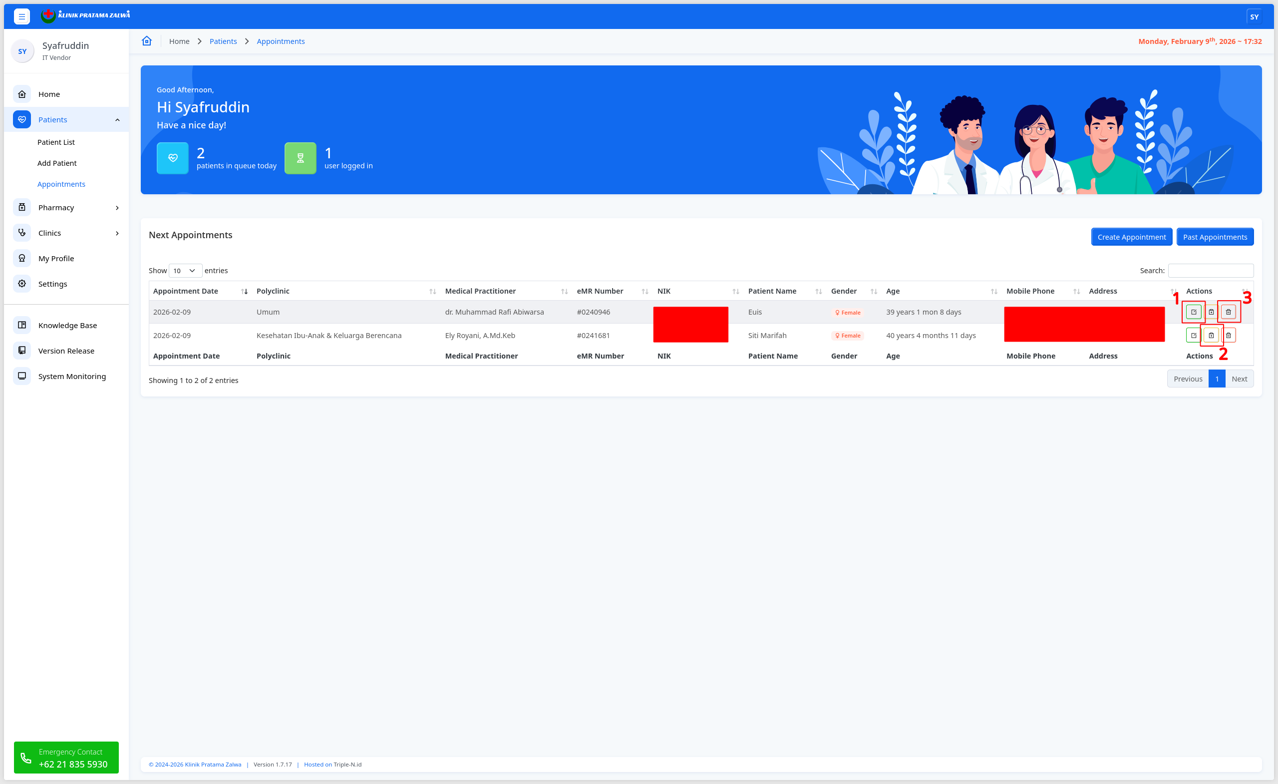 Setiap data perjanjian antara pasien dengan praktisi medis dapat dilakukan beberapa fungsi yang ditandai dengan tombol di sebelah kanan pada masing-masing data pasien (pada gambar di atas).