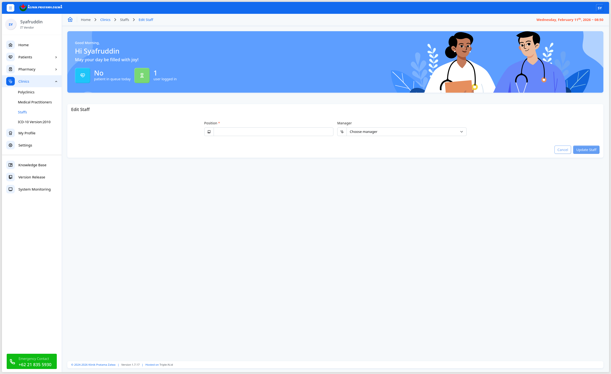 Halaman Edit Staff menampilkan halaman untuk melakukan perubahan data staf yang ada pada Klinik Pratama Zalwa.
