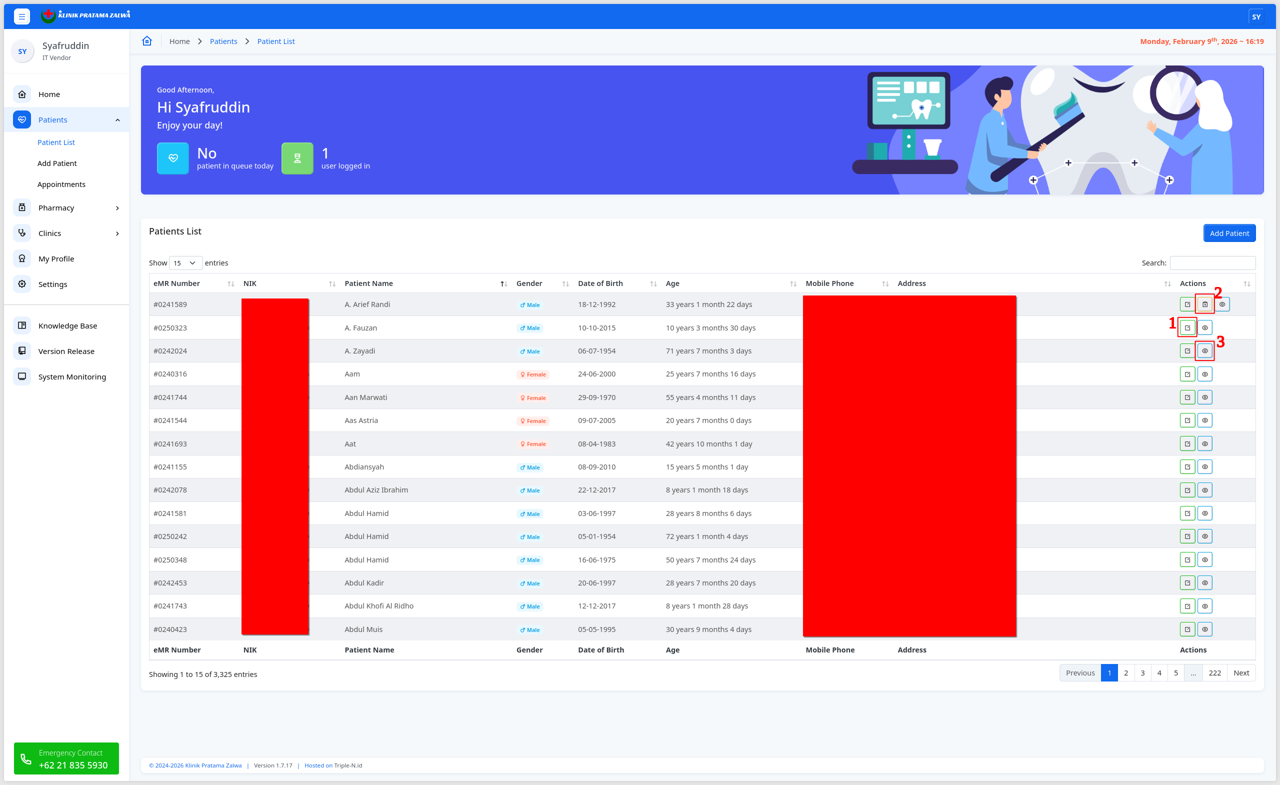Setiap data pasien dapat dilakukan beberapa fungsi yang ditandai dengan 2 (dua) atau 3 (tiga) tombol di sebelah kanan pada masing-masing data pasien.