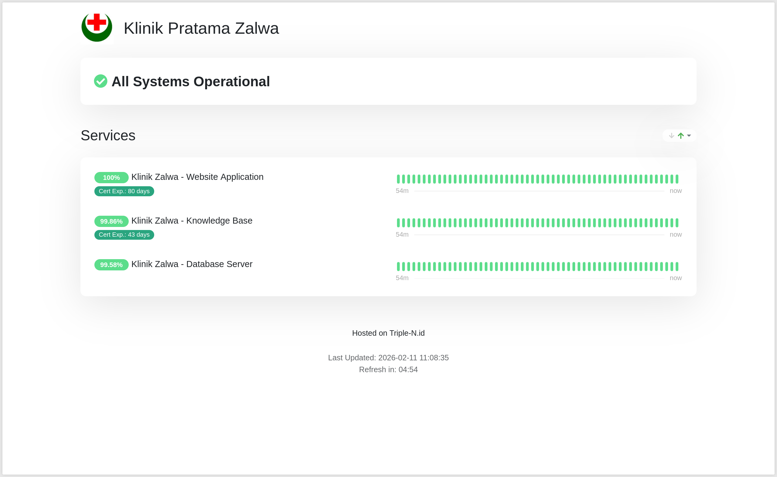 System Monitoring adalah halaman yang melakukan monitoring komponen aplikasi Klinik Pratama Zalwa. Sistem ini bekerja secara terpisah dari sistem aplikasi, sehingga gangguan pada sistem aplikasi Klinik Pratama Zalwa dapat termonitor pada halaman ini. Halaman ini dapat diakses pada link: https://eyes.triple-n.id/status/klinik-zalwa.